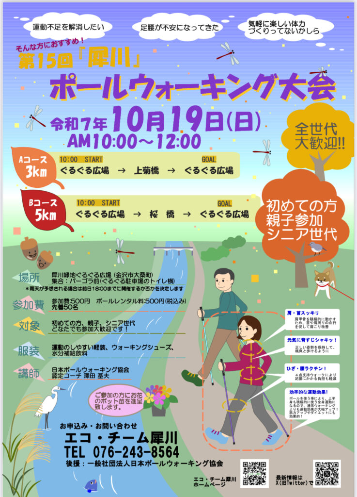 遅くなりました。エコチーム犀川主催による秋のポールウォーキング大会が令和7年10月19日(日)10時から12時まで開催されます。